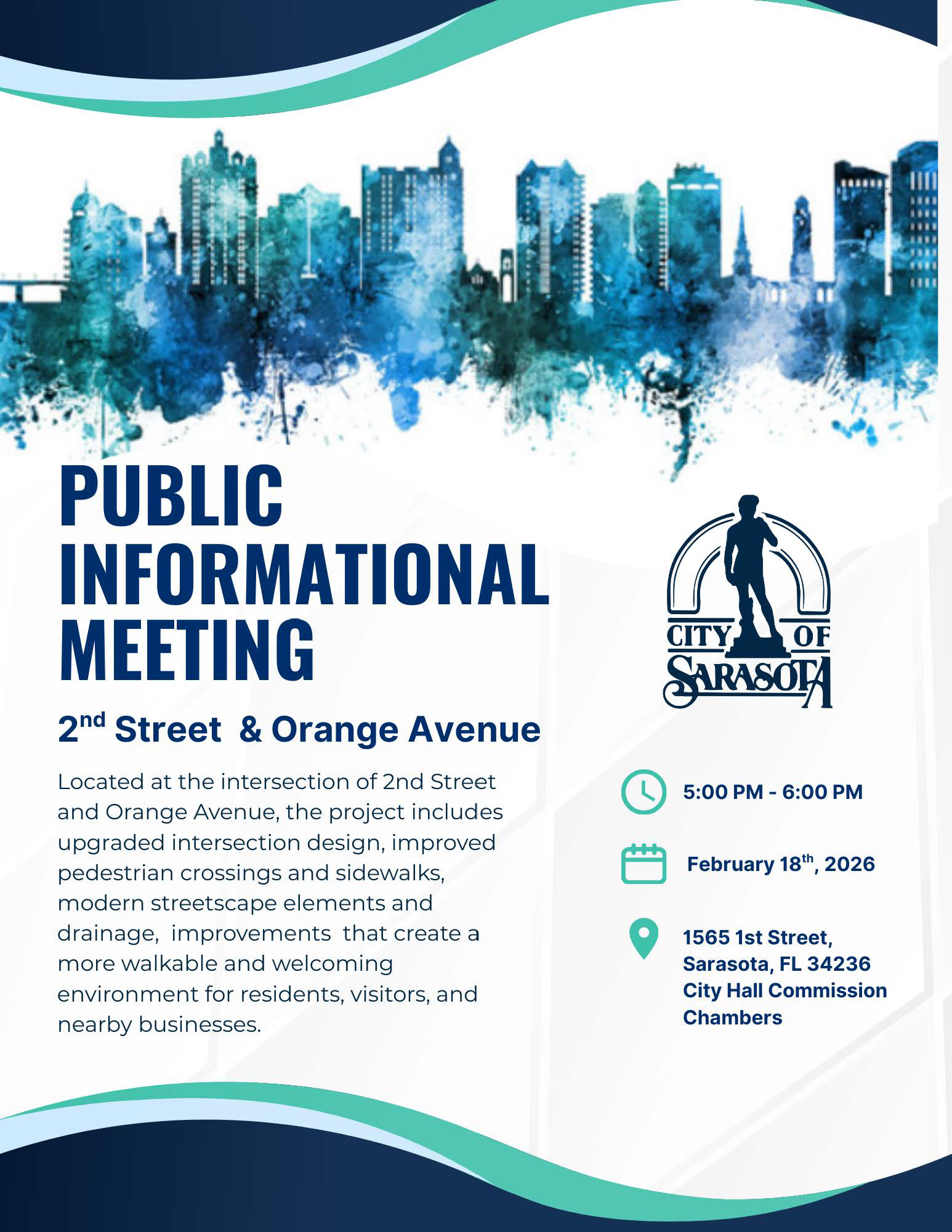 The City of Sarasota is planning improvements at the intersection of 2nd Street and Orange Avenue, along with corridor enhancements in the surrounding area. This project focuses on improving safety, accessibility, and comfort for people walking, biking, driving, and accessing nearby businesses and destinations.